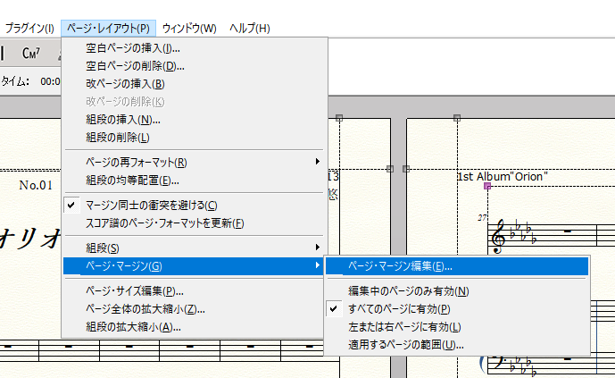 メニューバー「ページ・レイアウト」>「ページ・マージン」>「ページ・マージン編集」を選択。